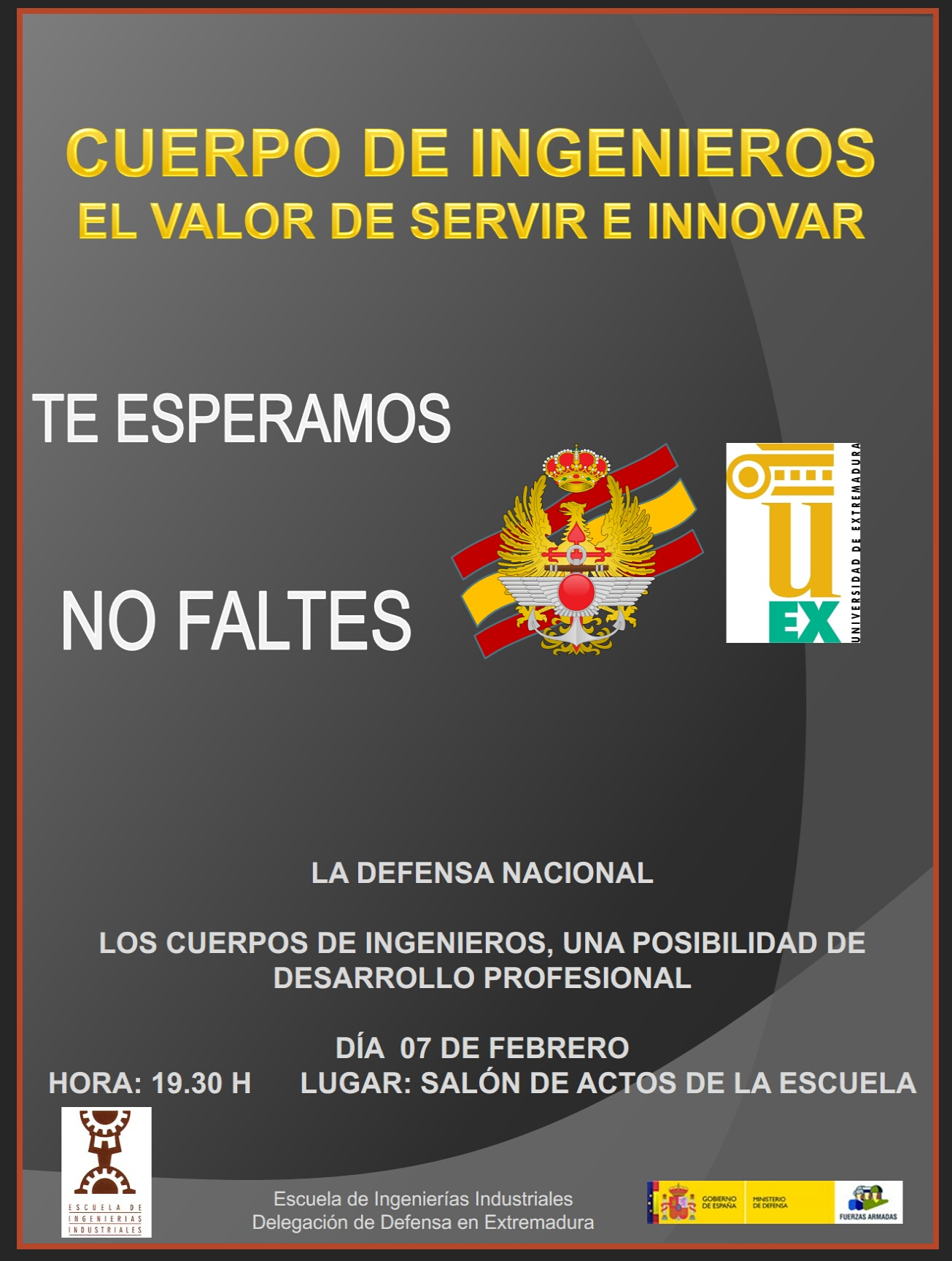 El próximo día 7 de febrero a las 19:30, se celebrará en la Escuela de Ingenierías Industriales una conferencia-coloquio organizada por la Delegación de Defensa en Extremadura, en la cual se hablará de las posibilidades profesionales de los Ingenieros en el ejército.