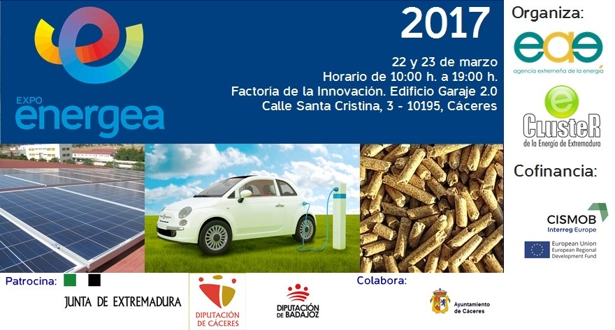 Los próximos días 22 y 23 de marzo, tendrá lugar la tercera edición del Evento Internacional de las Energías Renovables, EXPOENERGEA 2017, organizado por Agenex y el Clúster de la Energía, que se celebrará en Cáceres los días 22 y 23 de Marzo en el Edificio Garaje 2.0.