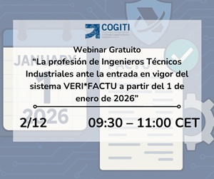 Desde el Consejo General, se informa del Webinar Gratuito "La profesión de Ingenieros Técnicos Industriales ante la entrada en vigor del sistema VERI*FSCTU a partir del 1 de enero de 2026", que tendrá lugar el 2 de diciembre de 2025 a las 9:30-11:00 horas.