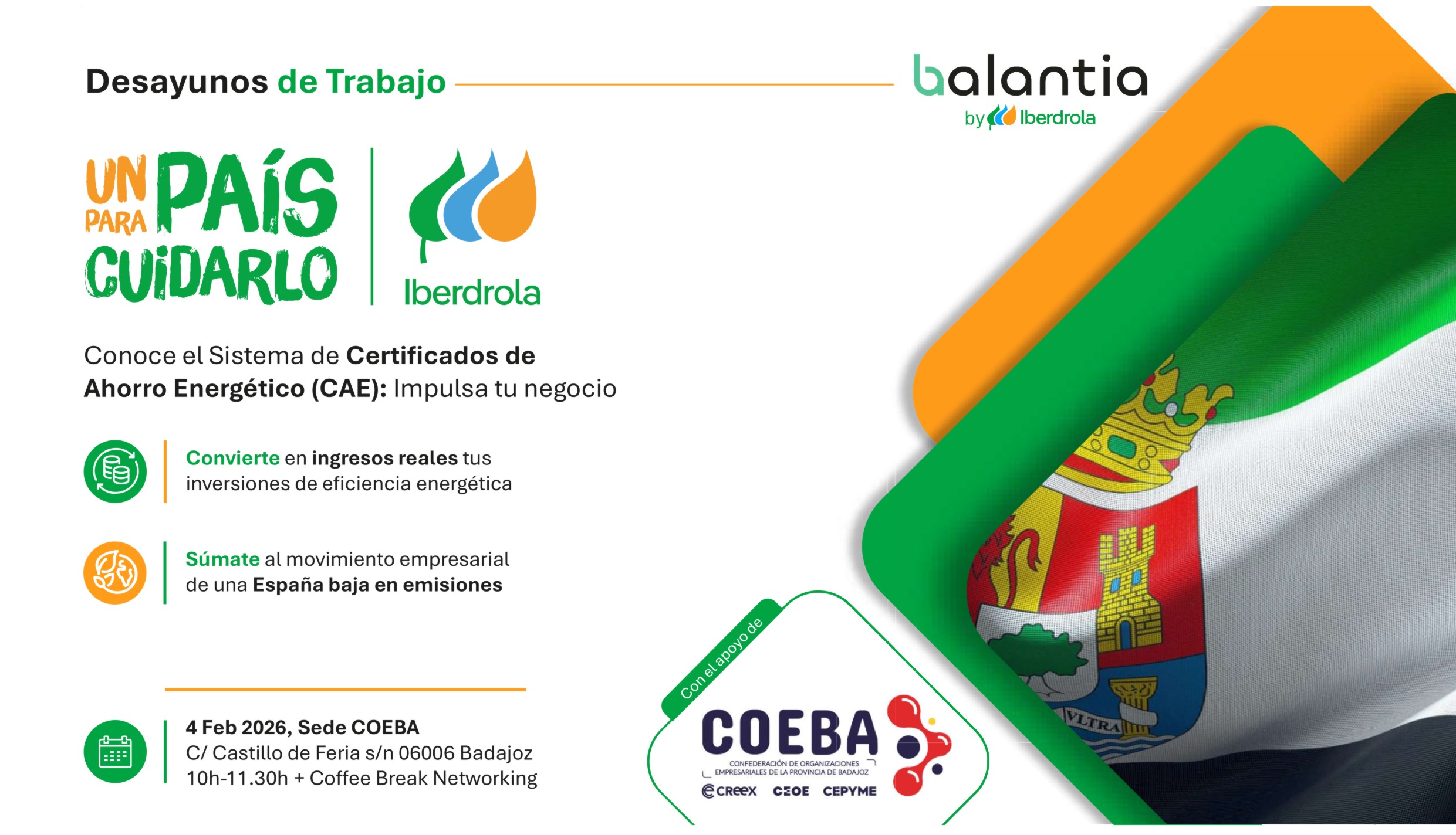 IBERDROLA y Balantia by Iberdrola, en colaboración con COEBA, organizan un desayuno de trabajo empresarial que tendrá lugar el próximo 4 de febrero, de 10:00 a 11:30 h, en la sede de COEBA (Badajoz), bajo el lema “Un País para Cuidarlo”.