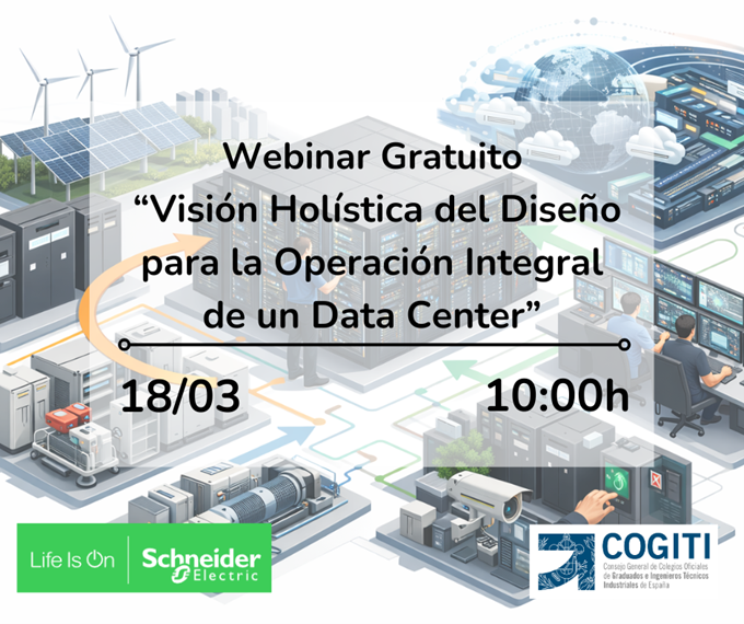 Continuando con el ciclo de “Los miércoles tecnológicos”, el Consejo General, los Colegios Oficiales y Schneider Electric presentan el Webinar Gratuito "Visión Holística del Diseño para la Operación Integral de un Data Center", que tendrá lugar el 18 de marzo de 2026 a las 10:00 horas.